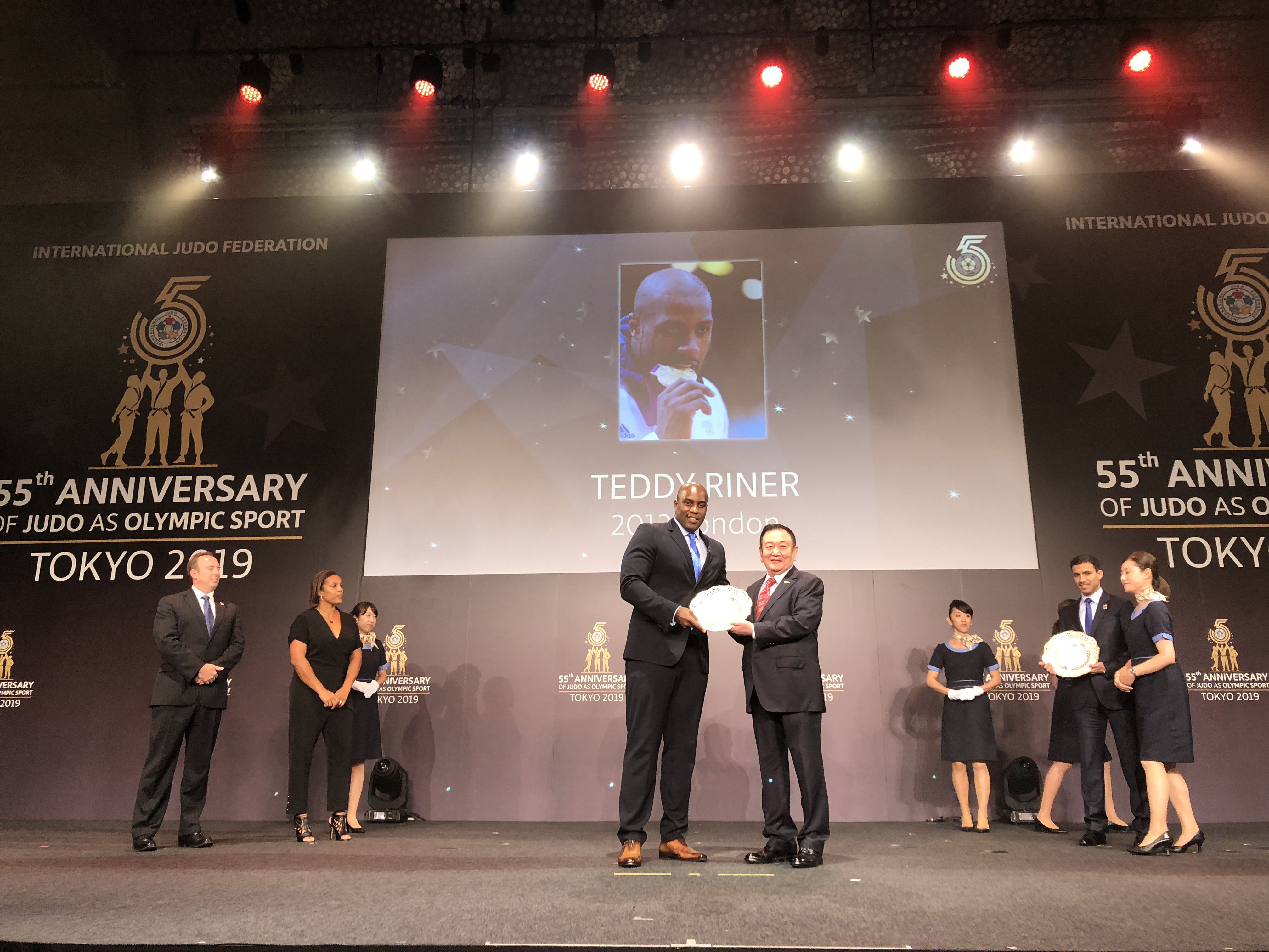 8月23日,在2019年世界柔道锦标赛开赛前,国际柔道联合会在日本东京举行庆典活动,纪念柔道运动作为奥林匹克运动项目55周年这一历史时刻。仪式上,国际柔道联合会将近60年来为世界柔道运动做出贡献的运动员与组织机构颁发奖项。hth·华体产业集团作为国际柔道联合会顶级合作伙伴受邀出席,董事长卞志良作为特邀嘉宾为伦敦奥运会最佳男运动员Mr. Teddy Riner,伦敦奥运会最佳女运动员Mrs. Lucie Decosse 颁奖。